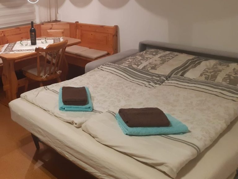 🔹 Queensize-Bett (2P) + optional: Schlafsofa (1P) / Zustellbett (1P) & Babybett